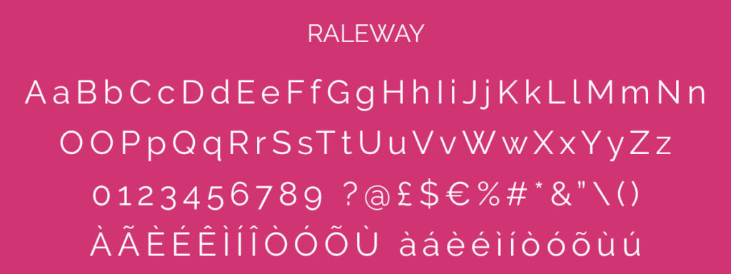 - Main font = Raleway. This is used in our logo and for all the headings and subtitles on our website.