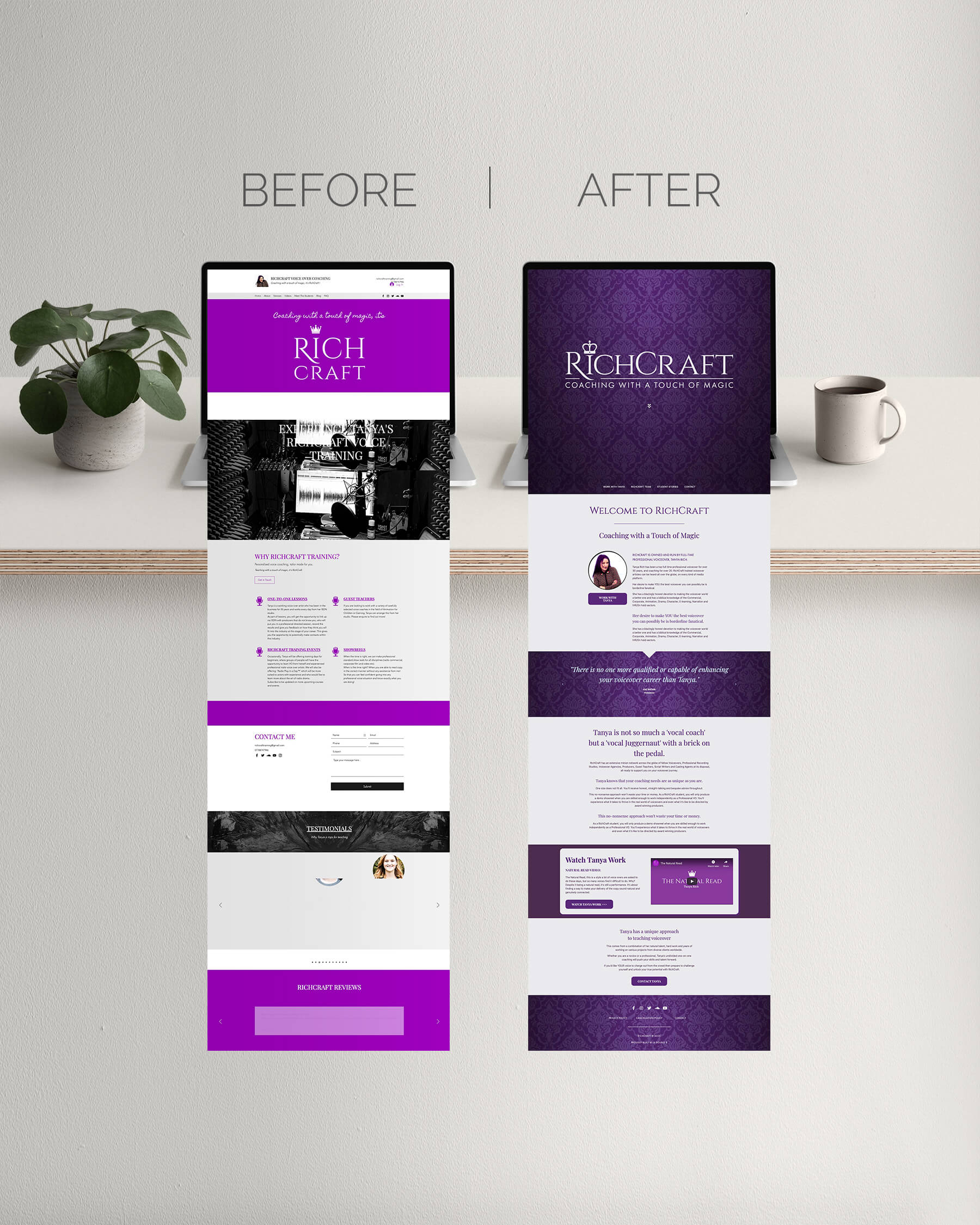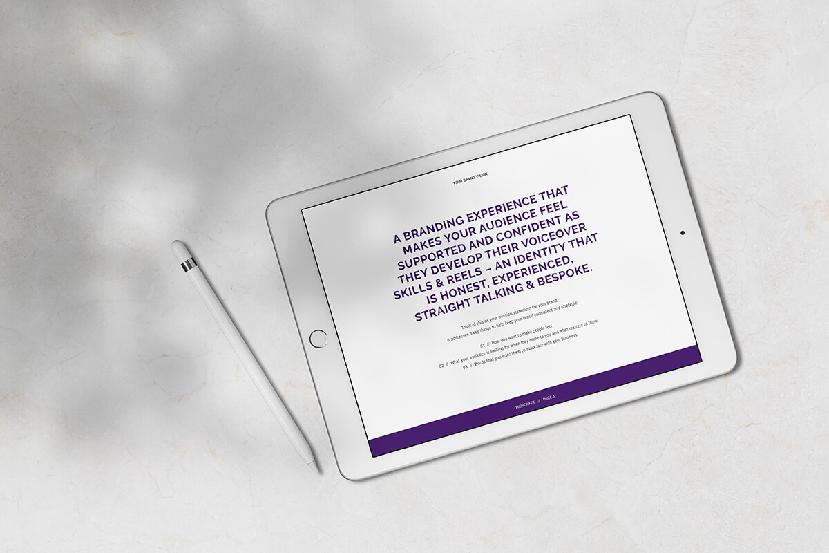 Voice coach Tanya Rich wanted to update her voice coaching brand and website RichCraft. She already had a website, but wanted a custom build, and wanted to update her logo. The RichCraft branding needed to align with her existing voiceover brand, but also be recognisable in its own right.