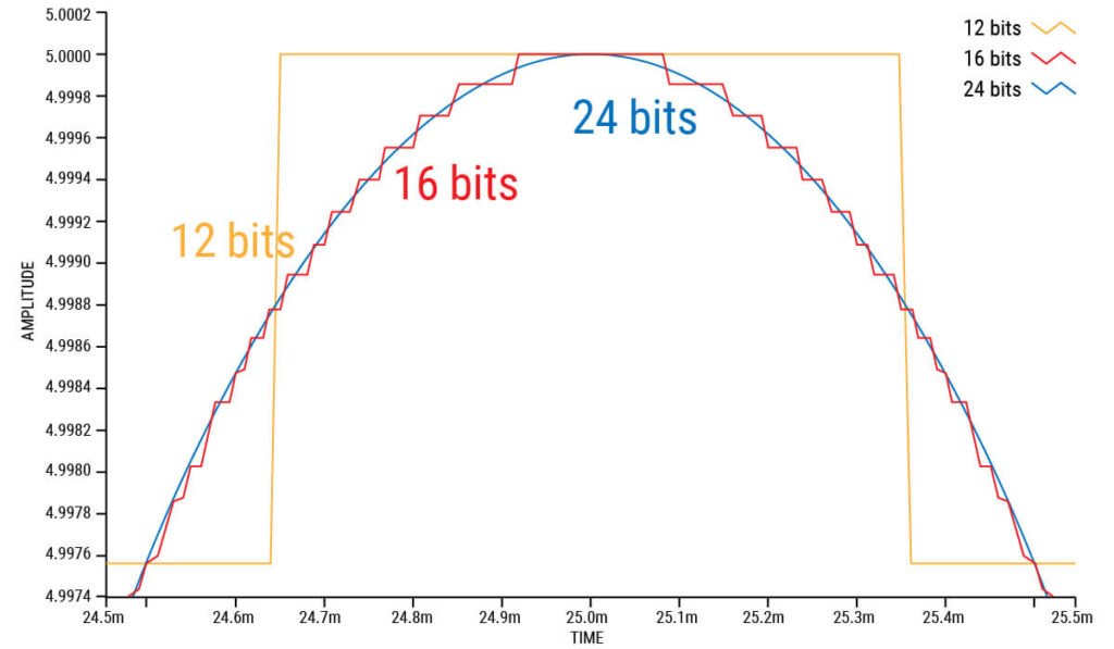As we progress along the X-axis (pass through time) a reading is taken of where the sound wave is on the Y-axis. The Y-axis measurement is a binary reading and is known as the bit depth of the audio. A 16-bit reading has 16 digits, a 24-bit reading has 24. The higher the bit depth, the bigger the dynamic range (the space between the loudest and quietest bits the system can manage).